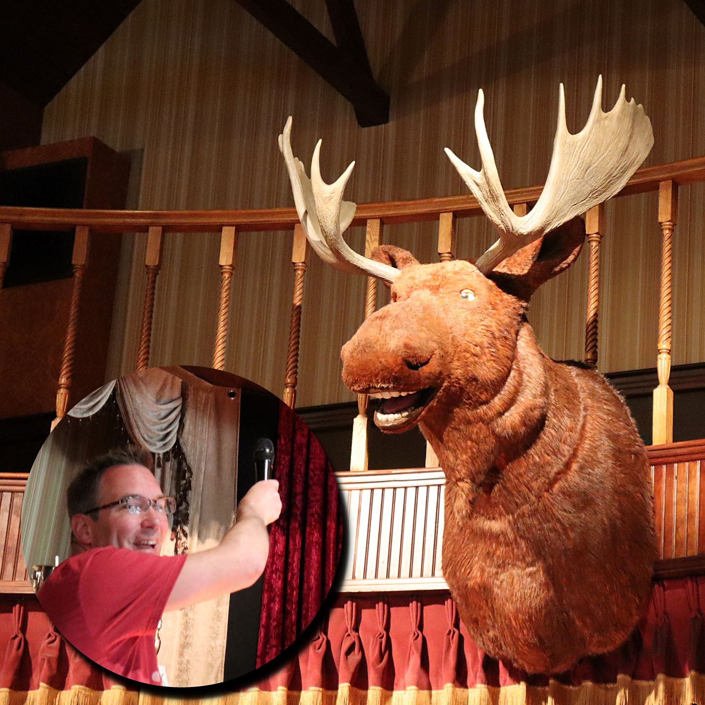 Meet Marvin the Moose. He has been hanging around the High Moon Saloon since late May. Oh, he was shy at first. Didn’t say much. But now, he’s pretty comfortable in his new digs. And people! In fact, some of his favorite things to do is getting to know the park guests, and he does that with his brand new show, “Critter Chitter Chatter: Starring Marvin the Moose with No Caboose.”