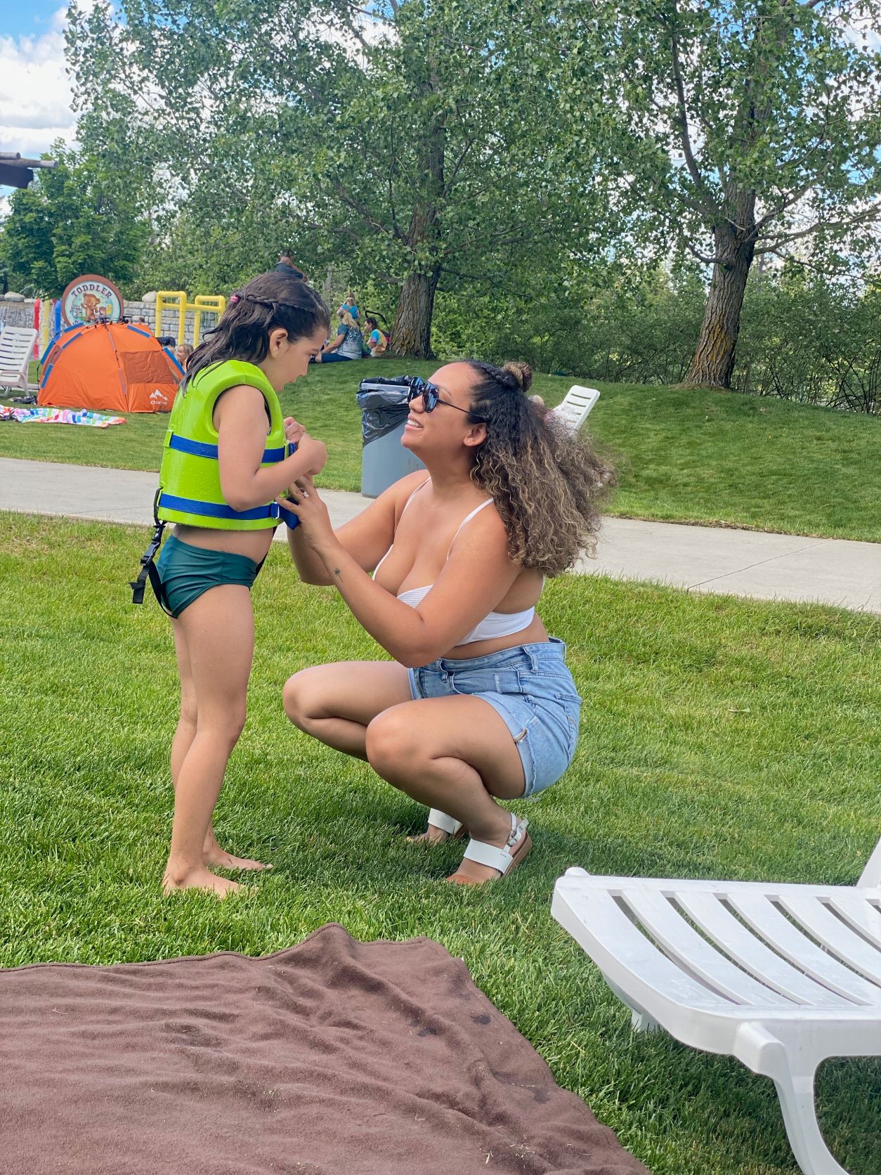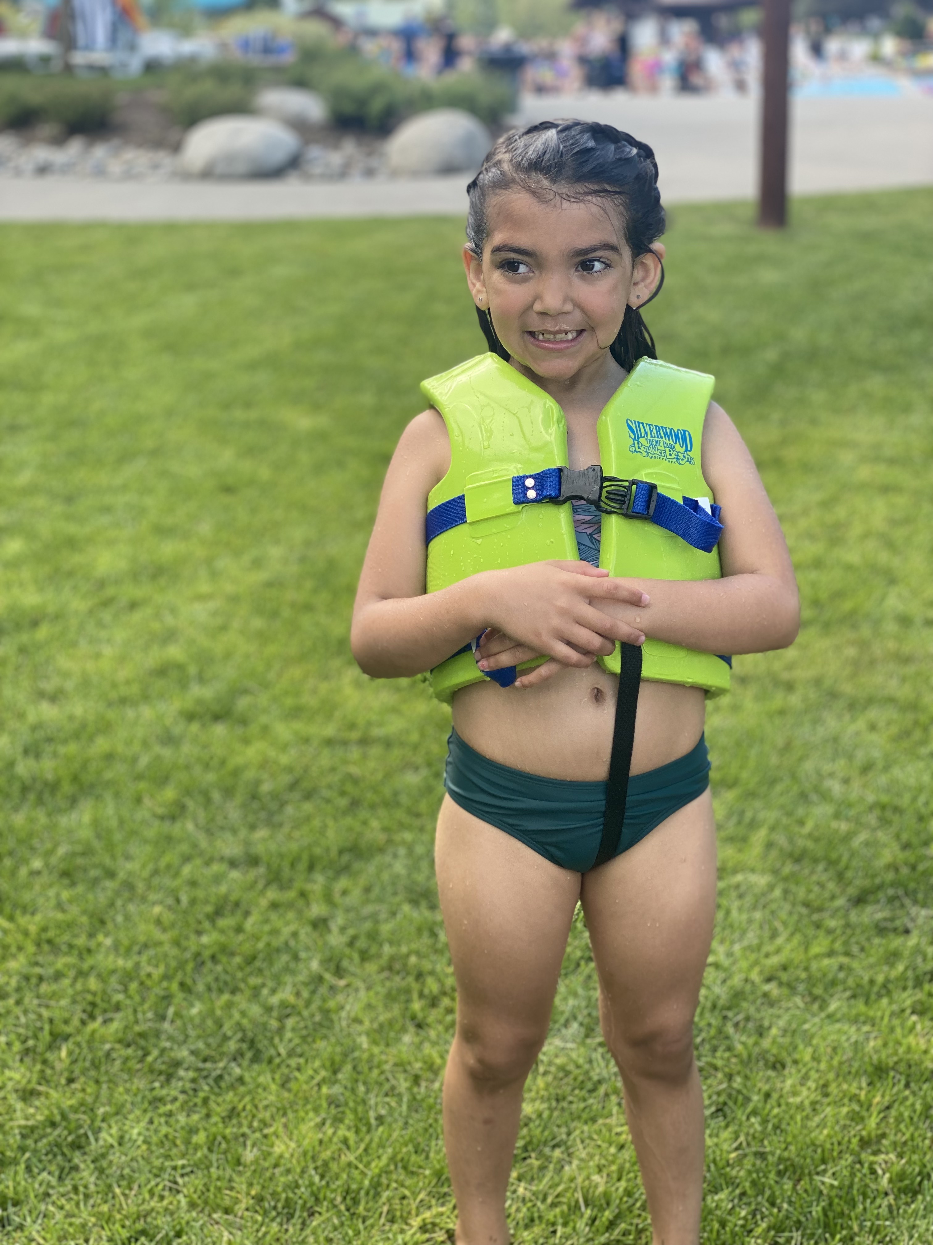 My best advice from being a lifeguard for a long time is to keep littles dressed in water-safe colors. What does that mean? Well, it means you want to stick to bright colors for the bathing suits so the guard can see them underwater. Anything too light, especially on a busier day, is much harder to see. It is something I truly find helpful. Kiddos love those bright colors.