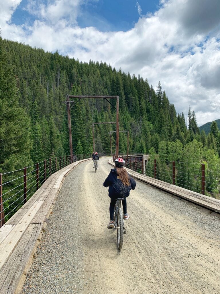 One of the most unique experiences in north Idaho is the Route of the Hiawatha mountain bike & hiking trail, a 15-mile long trail with 10 train tunnels & 7 sky-high trestles. It is one of the only 15 “Rail to Trail” trails in the country.