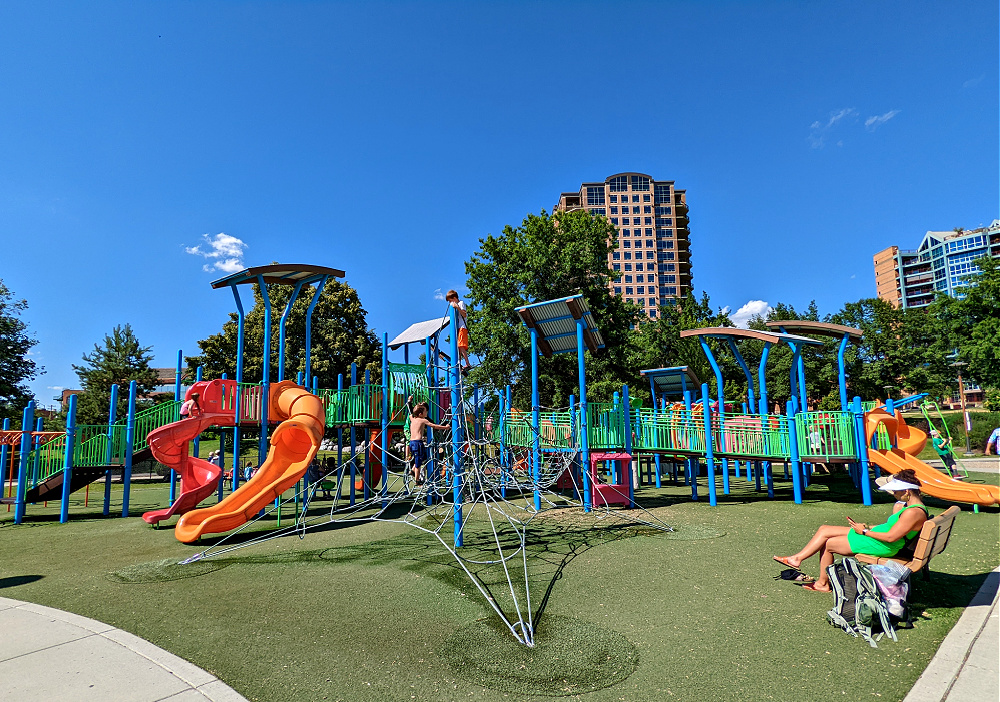 The Fort Sherman playground in Couer d’Alene is part of the City Beach park, located just west of the downtown area. It’s the perfect location as your kids can play hard on this fort-themed playground & then walk over to the beach to cool off in the lake when hot & sweaty. The park has huge trees to provide shade for those warm summer days. The wooden fort playground has everything from slides, swings, tire swing, and climbing areas. The best part for parents – this playground is totally fenced in with one entrance – parents can relax & sit on one of the many benches while kids have a blast playing!