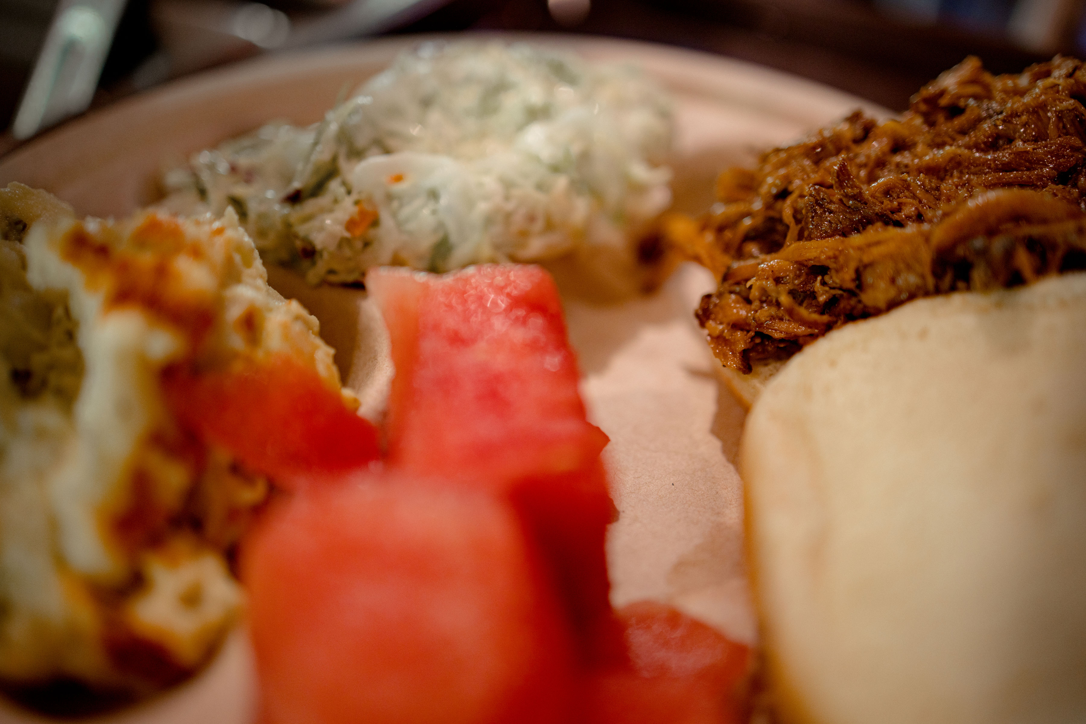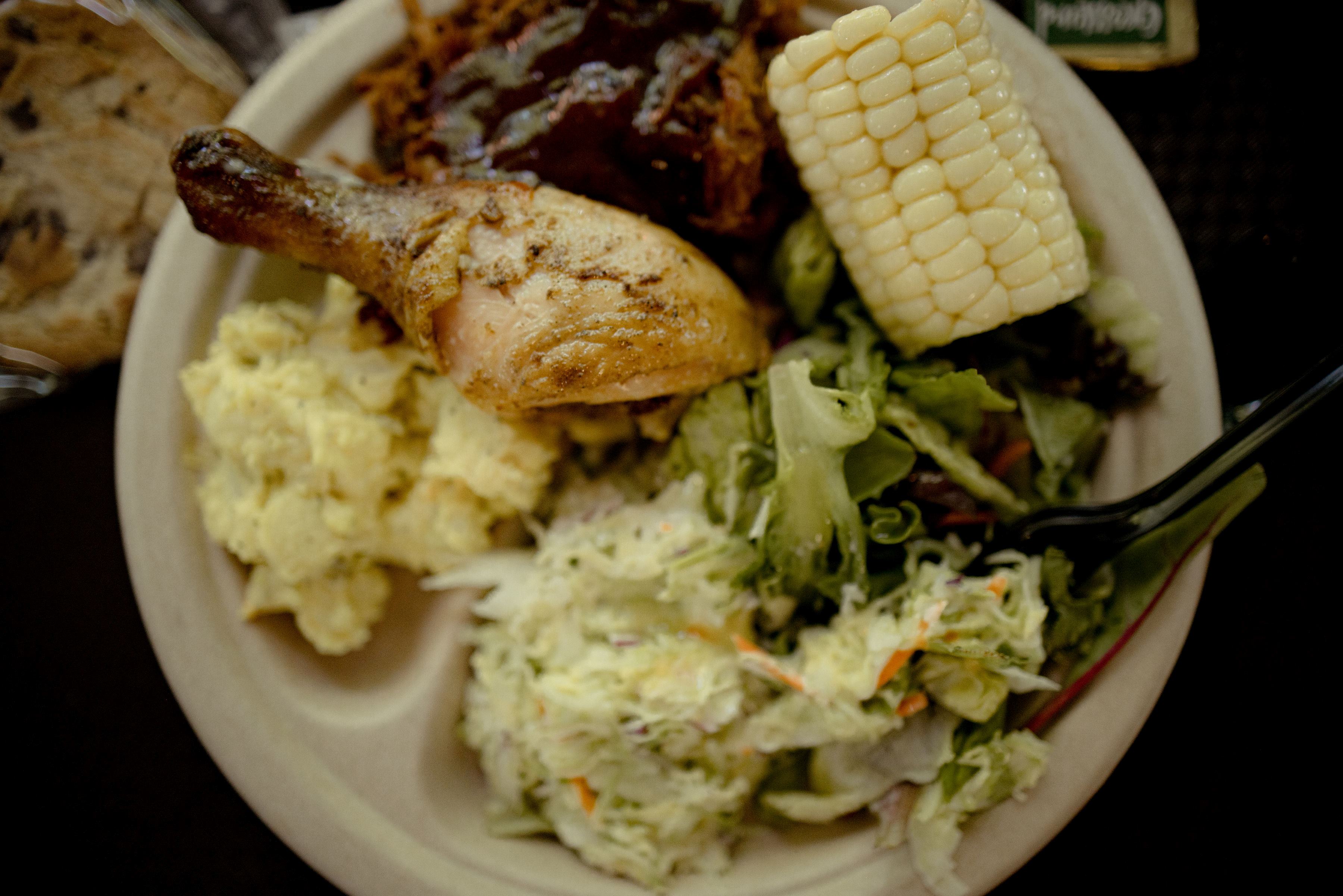 The food includes: delicious wood-grilled chicken quarters, tender pulled BBQ pork, buns, hot dogs, mac and cheese, coleslaw, cornbread, country green beans, baked beans, corn on the cob, garden salad, watermelon, cookie, and assorted Pepsi beverages, lemonade, iced tea and water.