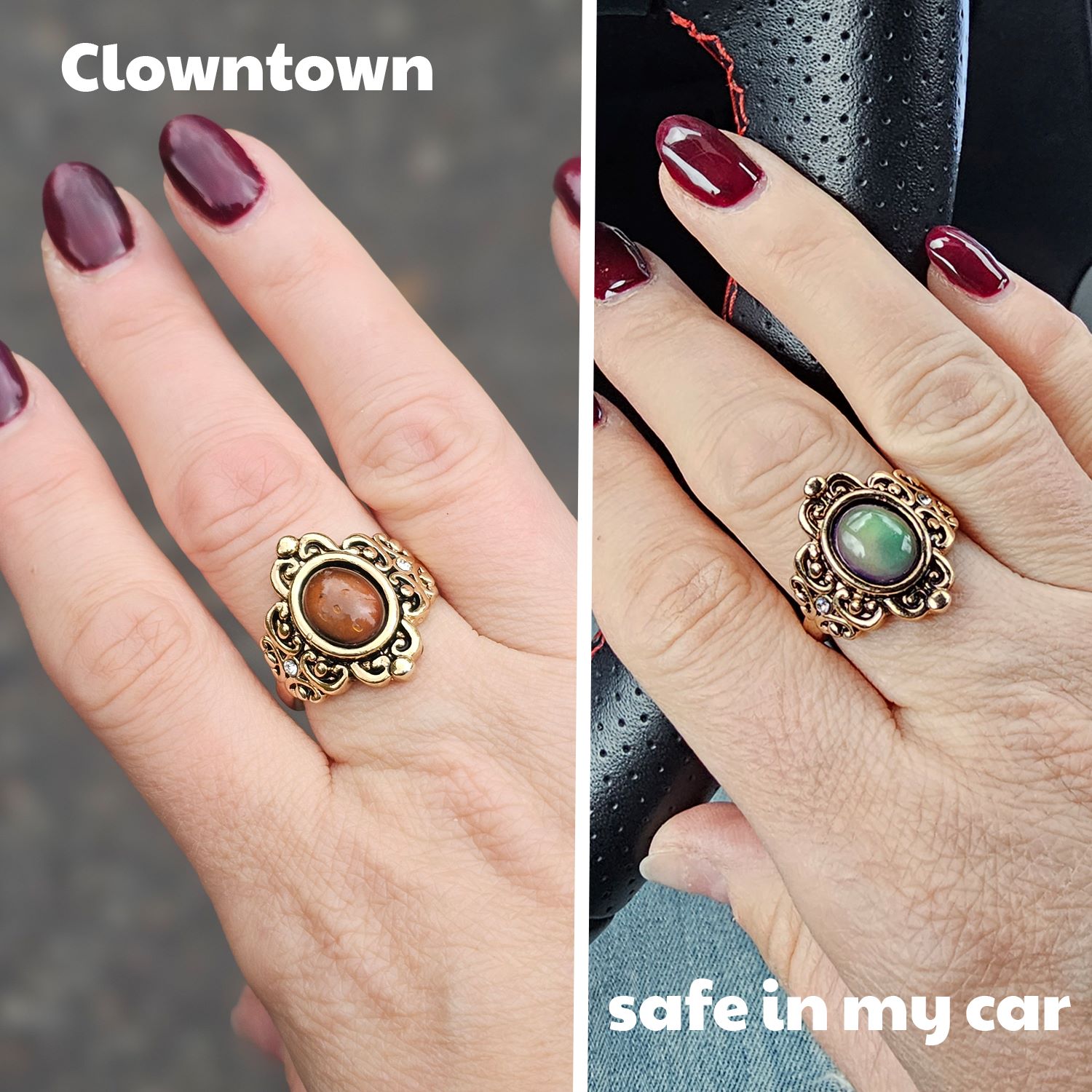 The logical side of me laughs and tried to tell myself that the clowns here are NOT real. But the closer I stepped to them, the details were all too scary. It’s those darn teeth and the beady eyes that creep me out. I swear I could hear music from the movie IT playing in my head. Check out how my mood ring changed from being in Clowntown vs. me in my car.