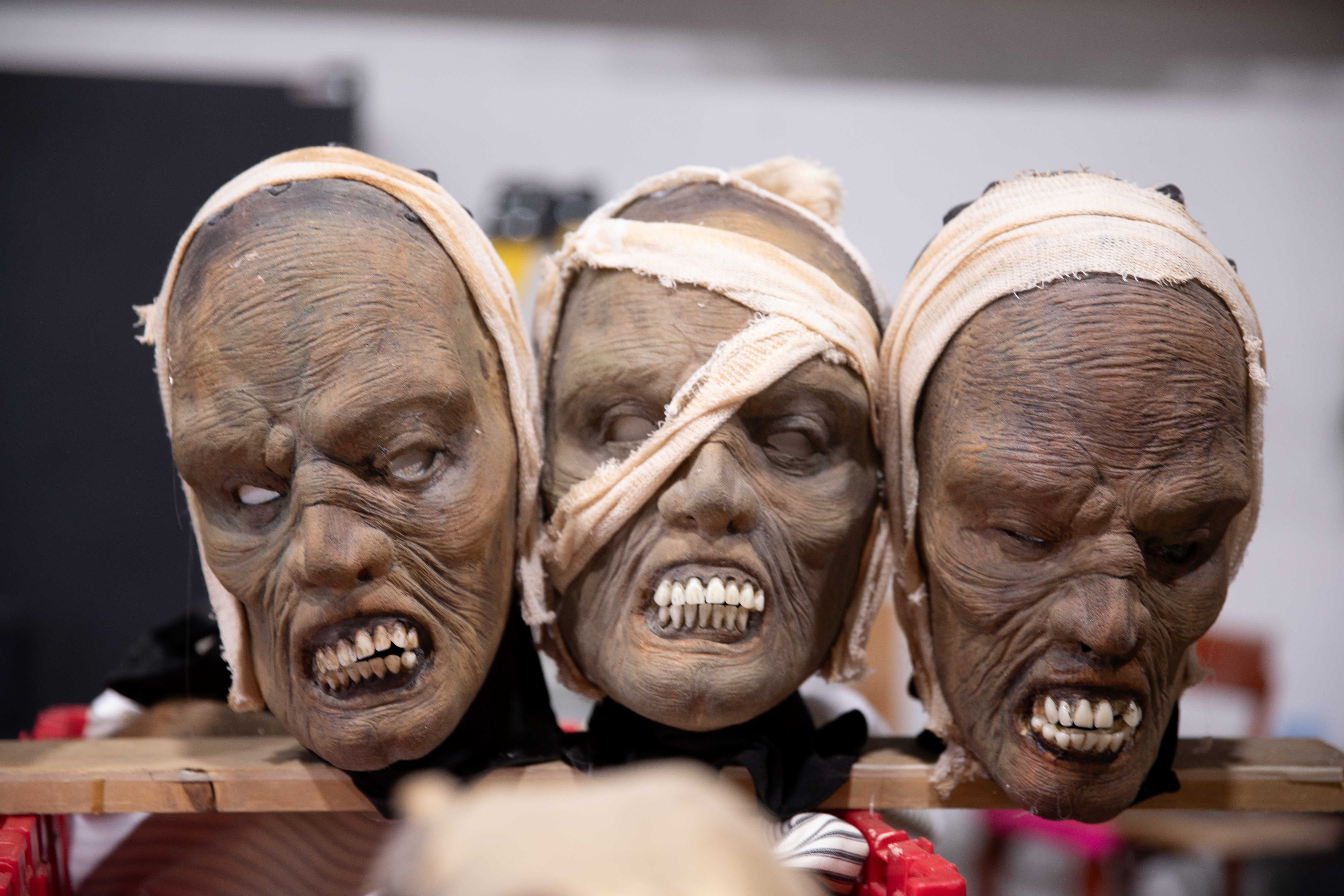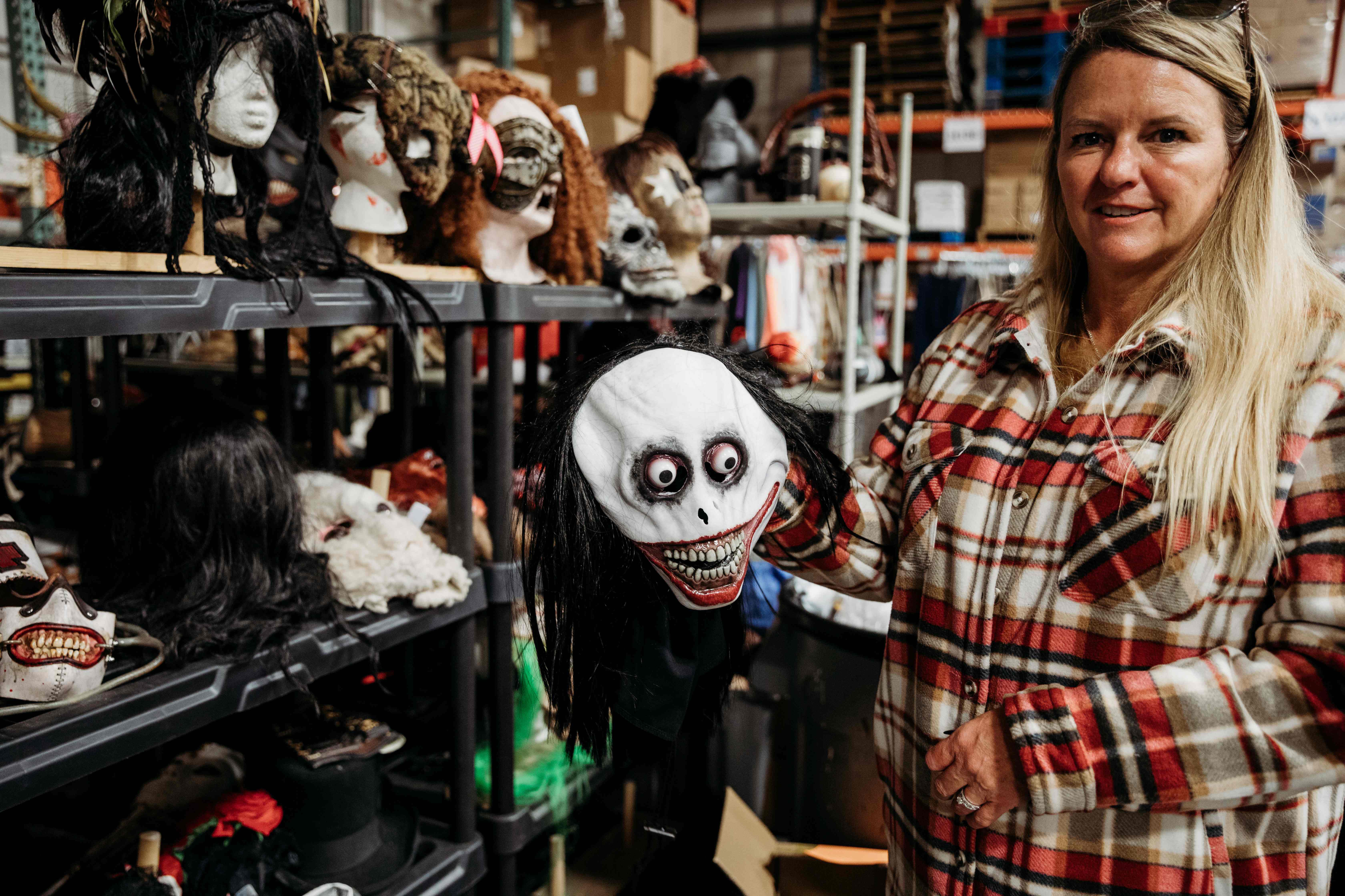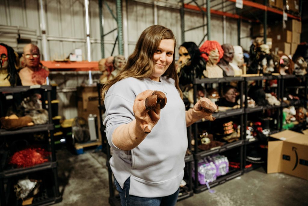 I was greeted by RaeAnne, who is head of the costume warehouse where you can find HUNDREDS of costumes and shelves filled with masks. These warehouses are their own theme park and a spooky wonderland! A few years ago, I got to do a blog post about makeup at Scarywood, where my daughter and I got to be victims of becoming a Scarywood clown. The process of seeing a creature come to life was so exciting. I loved every moment of it. No way I could leave the park without taking that character with me to pick up the kids from school that day.