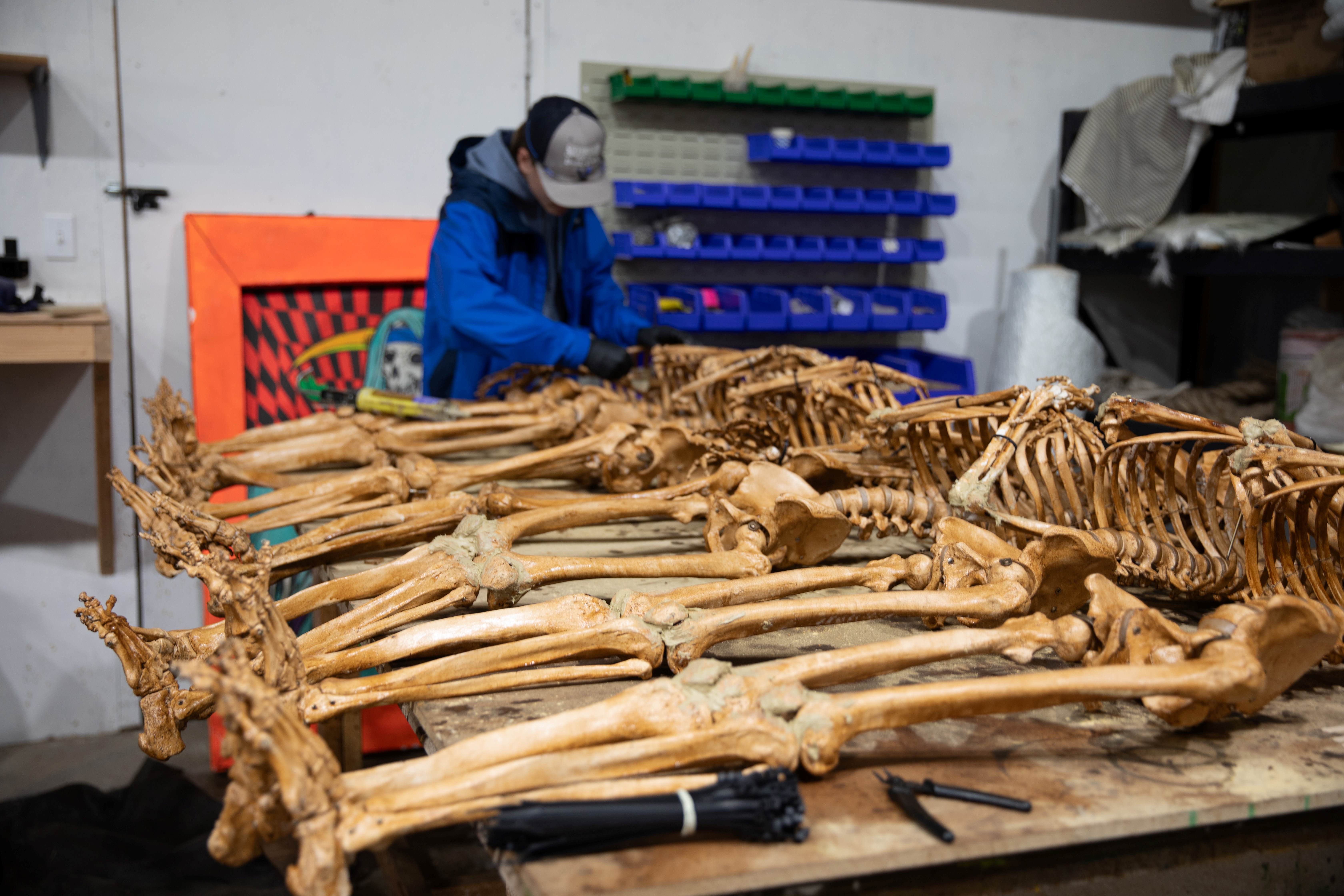 I started my journey meeting with Tanner, who is the head creator of Everything Scary and has been with Silverwood for 9 seasons and has a very impressive art background. Did you know that Silverwood has a warehouse for Scarywood that houses all props and scenery?! Inside the warehouse is where spooks are envisioned and created. On the day I visited the team, skeletons were laid across the table, getting their final touchups before opening day.