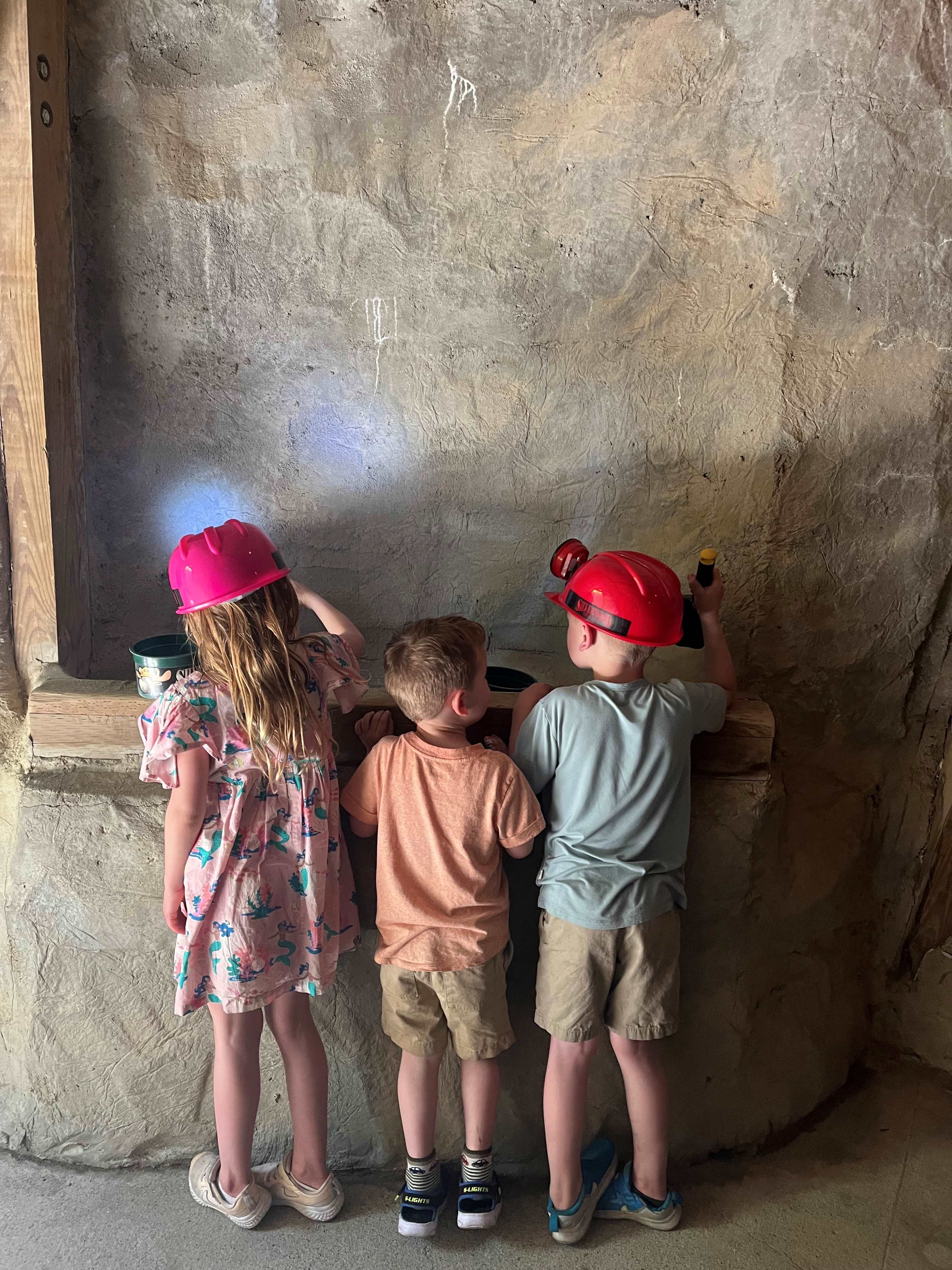 At first glance, Mine Shack appears to be a gift shop. Head inside, however, and you’ll see the opening to a “mine”, where, for a small fee, kiddos can grab a mining hat, and some tools and head into the mine to hunt for their own gems (colorful, polished rocks that our kids went crazy for!). Once they sift through the sand to find the gems, kiddos are welcome to keep as many as they can fit in their bag. Our kids also had a blast re-burying the rocks that wouldn’t fit in their bags, getting the mining area ready for the next group of kiddos to come through.