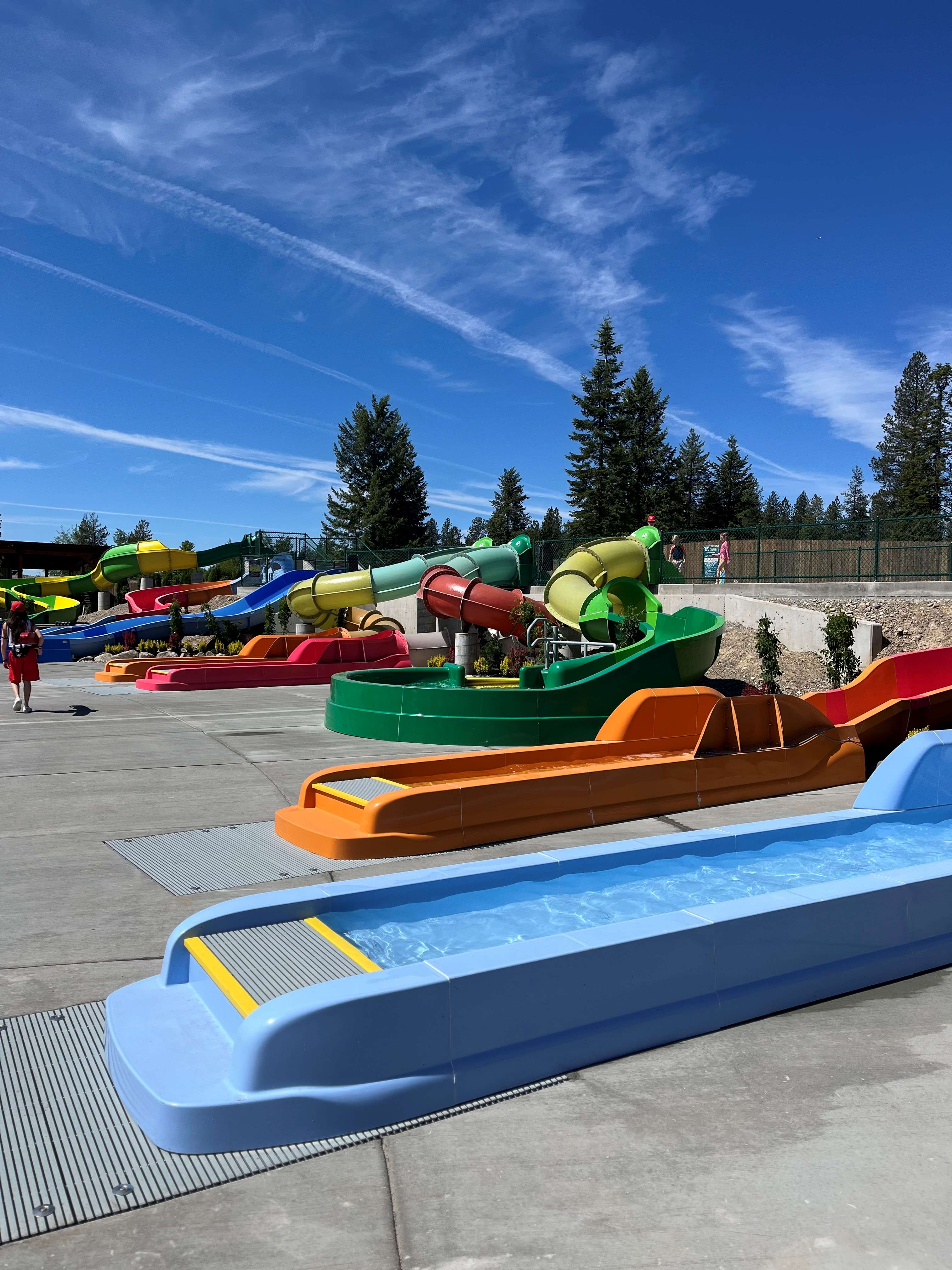 The Salmon Run is located in Emerald Forest, Boulder Beach’s newest expansion! It offers a toddler and kid-friendly splash pad and brand-new water slides for kiddos who may not be big or brave enough to hop on one of the larger water slides in the park. Our kids spent hours in the Salmon Run going down the different slides and running around the Splash Pad!