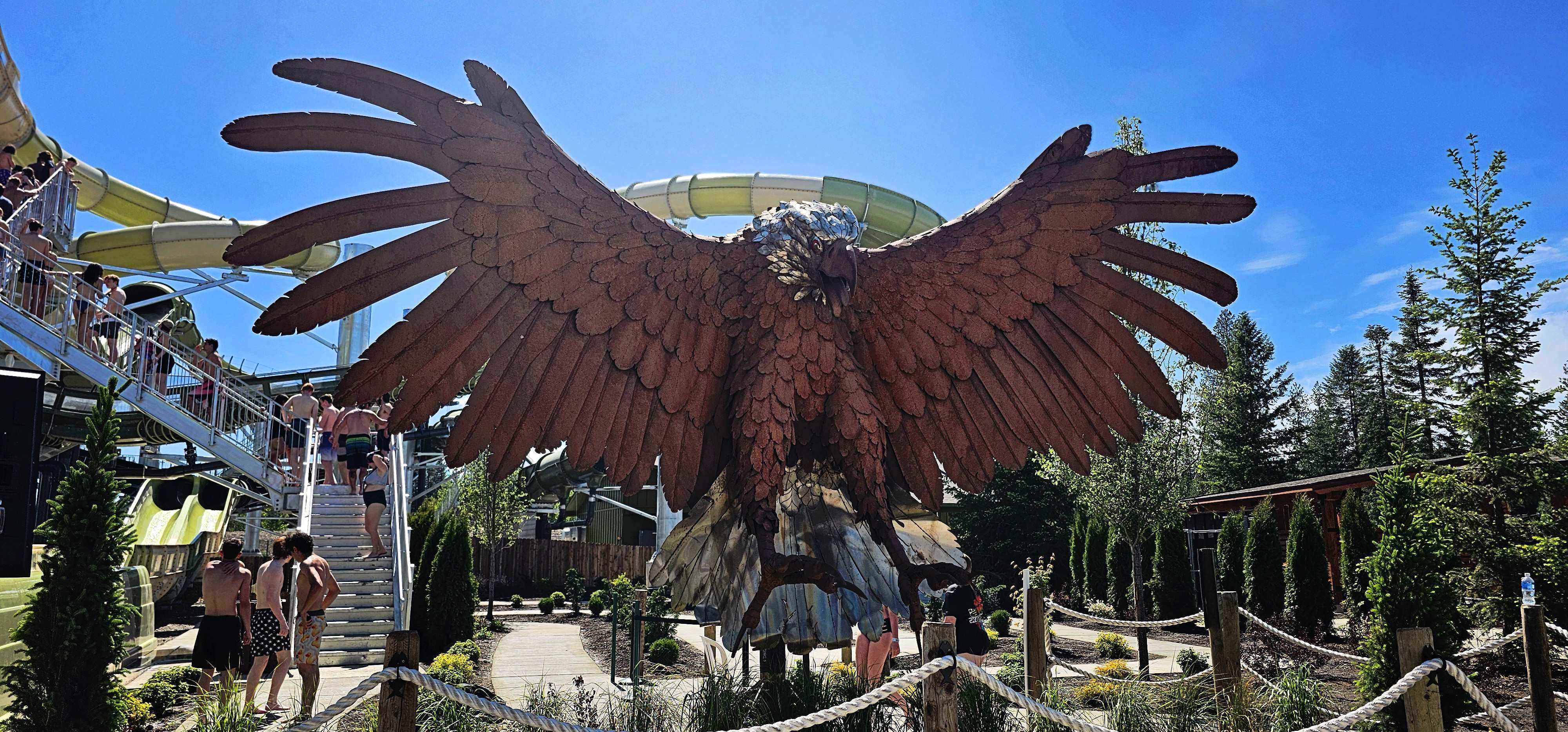 Eagle Hunt is the first dueling water coaster in the West and the LONGEST dueling water coaster in the United States. While you stand in line, you can read various facts and interactive elements focused on Eagles and their habitat- making the waiting fun to talk about before you reach the top. Standing at 925 feet in length, riders will race against the clock as they slide through 3 high-speed flying Saucers, get blasted up 4 hills, and dive through the first ProSlide Shadow Effect before you splash at the bottom.