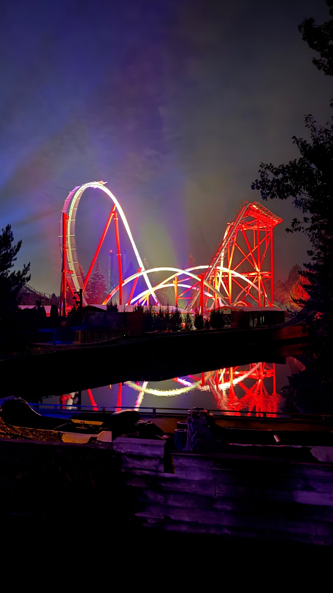 On a date? This is your romantic photo spot. Stunt Pilot lights up the sky and reflects into the Log Flume waters below. Trees frame the shot with their falling leaves, and you just may be able to steal a kiss before the kiss of death sneaks in for a photobomb.