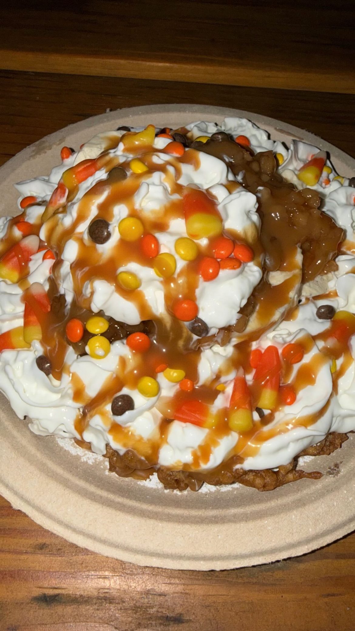 Our fall take on the fan favorite funnel cake! Whipped cream, powdered sugar, caramel, spiced apple, candy corn and reese’s pieces for the win!