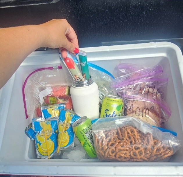• Snacks you know they’ll eat (we love goldfish, pretzels & go-gurt).